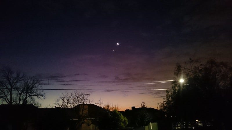 II. Wandering stars. I spent 33 years on our planet (πλανῆται in Greek literally means wandering star) without realizing that you can see both Jupiter and Venice side by side with your naked eye. And in the last two weeks, I’ve seen something similar to the image above almost every day we had a clear sky: