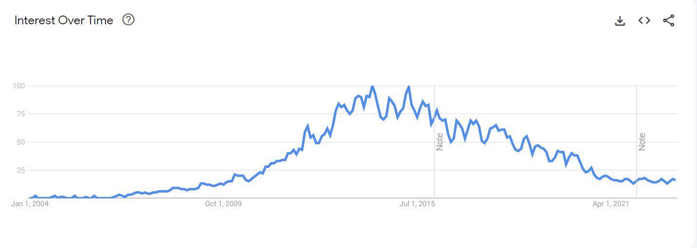 I can’t pinpoint the exact moment when TED talks disappeared from my feeds, but it must have been a few years now. And if we look at the TOP-10 TED talks of all time, we can see that all of them fall into the 2006-2014 timeframe. Google Trends, a great source for lazy journalists and bloggers, shows that interest in the subject peaked around 2013-2015 and has been declining ever since: